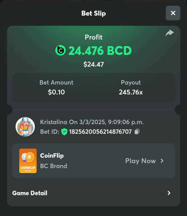 2. Easy 1. Deposit Txid: 4434113e293eb472a7b171d17fbe54cbfb34631824705869716f789ec0040181 2. Instagram: @LincesaMdq 3. Instagram Post: https://www.instagram.com/p/DHXgr4JspCP/?igsh=ZWgwenpqYXVreTF 4. Twitter: @Kristalinauwu 5. Like, retweet & tag: @Kristalinauwu https://x.com/Kristalinauwu/status/1901728054969274750 6. Follow BCGame Facebook: Gisela Gall 7. Limbo: https://bc.co/game-detail/1825513481832927011 8. Sports bet: Ticket ID: 2513820866270339253 9. Arabian Secret: https://bc.co/game-detail/1825439374915515681 10. Sugar Fiesta 1000: https://bc.co/game-detail/1825441146495751971 11. 2FA activated: Medium 1. Deposit TxID: 4d707ead402ff5771e270374a5fc42f5798fdc6bd13d6bf975996a5316cb53ff TxID: 39d9776a52287c2bdc8bea45c1a751ae618ef4976ed8907766ce39ac0603937f 2. Crash: https://bc.co/game-detail/1825546630112045702 3. Plinko: https://bc.co/game-detail/1825430753182757665 4. Roulette: https://bc.co/game-detail/1825527742035924514 5. Starshine Princess 1000: https://bc.co/game-detail/1825598330617384993 6. Stellar Rush: https://bc.co/game-detail/1825601183186807841 7. Keno: https://bc.co/game-detail/1825612623614982433 8: Poker Ways: https://bc.co/game-detail/1825547398747784483 9. Wukong: https://bc.co/game-detail/1825595350268898850 10. Lottery and Porsche tickets: 11. Sports bet Combo Ticket ID: 2512055034057994476 Hard 1. Wheel: https://bc.co/game-detail/1825529693239491107 2. Crash: https://bc.co/game-detail/1825774085023770502 3. CoinFlip: https://bc.online/game-detail/1825620056214876707 4. Stellar Rush: https://bc.co/game-detail/1826242186137422626 5. Plinko: https://bc.co/game-detail/1825459660201698850 6. Limbo: https://bc.online/game-detail/1826864347105905955 7. Hashdice: https://bc.online/game-detail/1826862839661034018 8. Sea of Olympus 1000: https://bc.co/game-detail/1825539068560977186 9. Gold of Olympus: https://bc.online/game-detail/1826344599486243619 10. Duck Hunter: https://bc.co/game-detail/1825605420251285539 11. Sports bet combo Ticket ID: 2513187573116055908